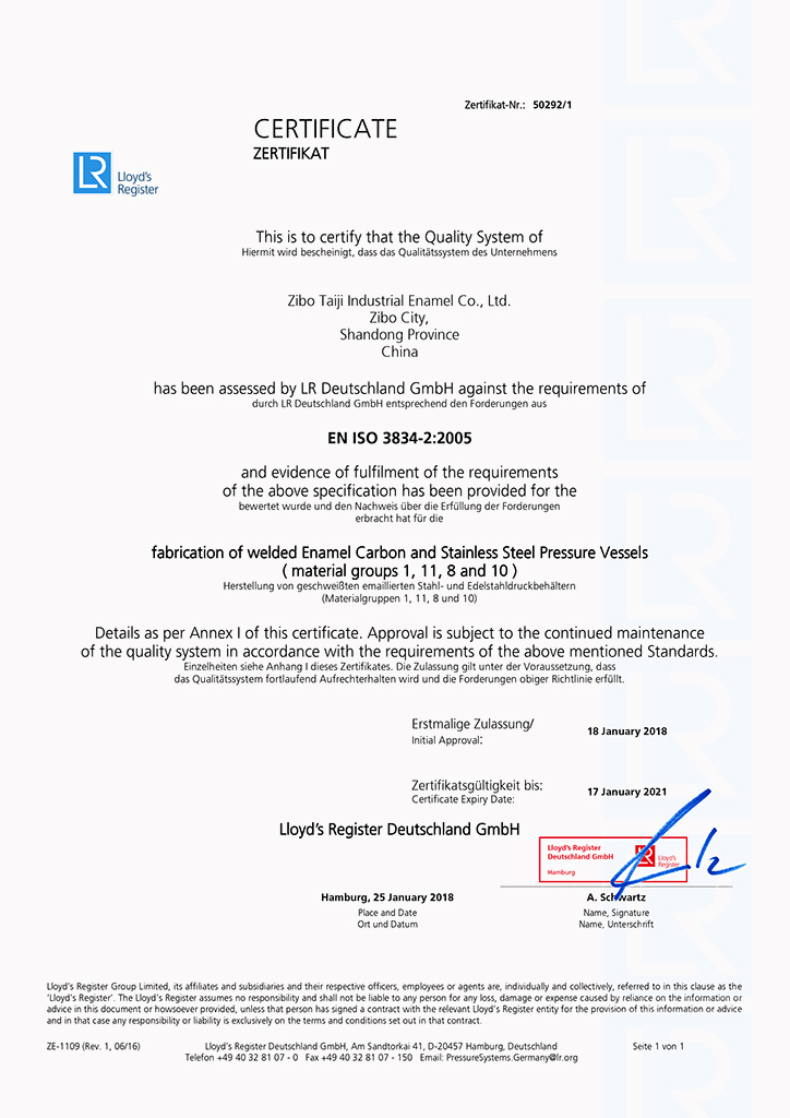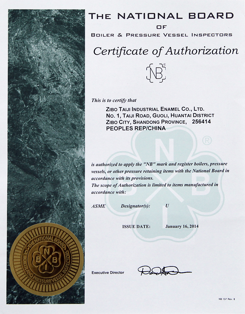 淄博太極在中國搪玻璃設備制造行業(yè)中首家通過ISO90001質量體系認證,并擁有美國ASME認證、歐洲PED認證以及國家部門頒發(fā)的搪玻璃制造許可證、進出口許可證和百余項榮譽證以及三十六項專利等。